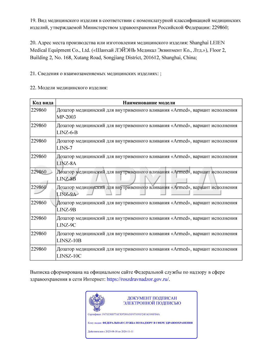 Дозатор медицинский для внутривенного вливания Армед LINZ-8A