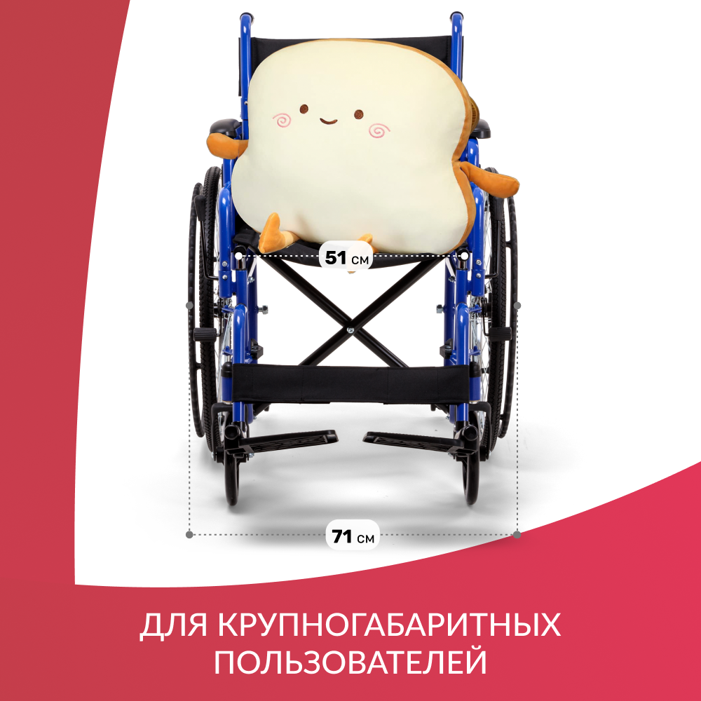 Идеальные габаритыКресло-коляска представлена в нескольких размерах. Вы легко подберете модель с габаритами, подходящими как для пользователей крупной комплекции, так и для простого преодоления узких дверных проемов и лифтов.Полная безопасностьНе переживайте о безопасности: каркас коляски изготовлен из прочной стали с защитным покрытием. Сидящий фиксируется в кресле регулируемыми ремнями, а встроенные антиопрокидыватели гарантируют устойчивость на неровных поверхностях. Коляска снабжена стояночными тормозами, которые прочно удерживают ее на время остановки.Удобство для сопровождающегоПроизводитель не забыл об удобстве сопровождающего: задние ручки управления оснащены эргономичными резиновыми накладками, препятствующими соскальзыванию и замерзанию рук. Очень полезным дополнением стал вместительный карман для вещей, расположенный на спинке коляскиДля любой комплекцииБлагодаря широкому размерному ряду и грузоподъемности до 120 кг данная коляска подходит для людей практически любого телосложения. Максимальная ширина сиденья составляет 51 см. Этого достаточно и для прогулок в холодное время года, когда объемная верхняя одежда стесняет сидящего.Мягко и уютноКомфорт в течение всего дня: каждая деталь кресла выполнена с заботой о сидящем. Сиденье и спинка инвалидной коляски очень мягкие и приятные телу, изготовлены из прочного водоотталкивающего материала.Характеристики