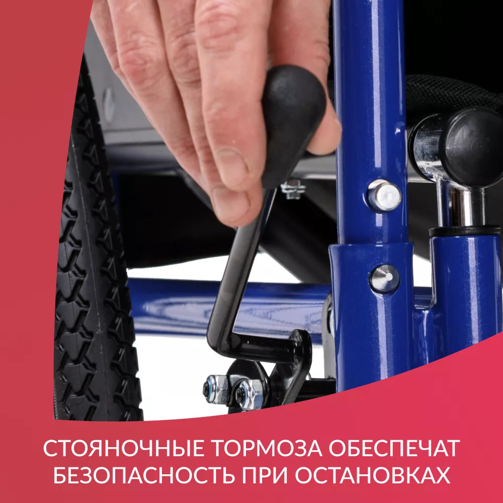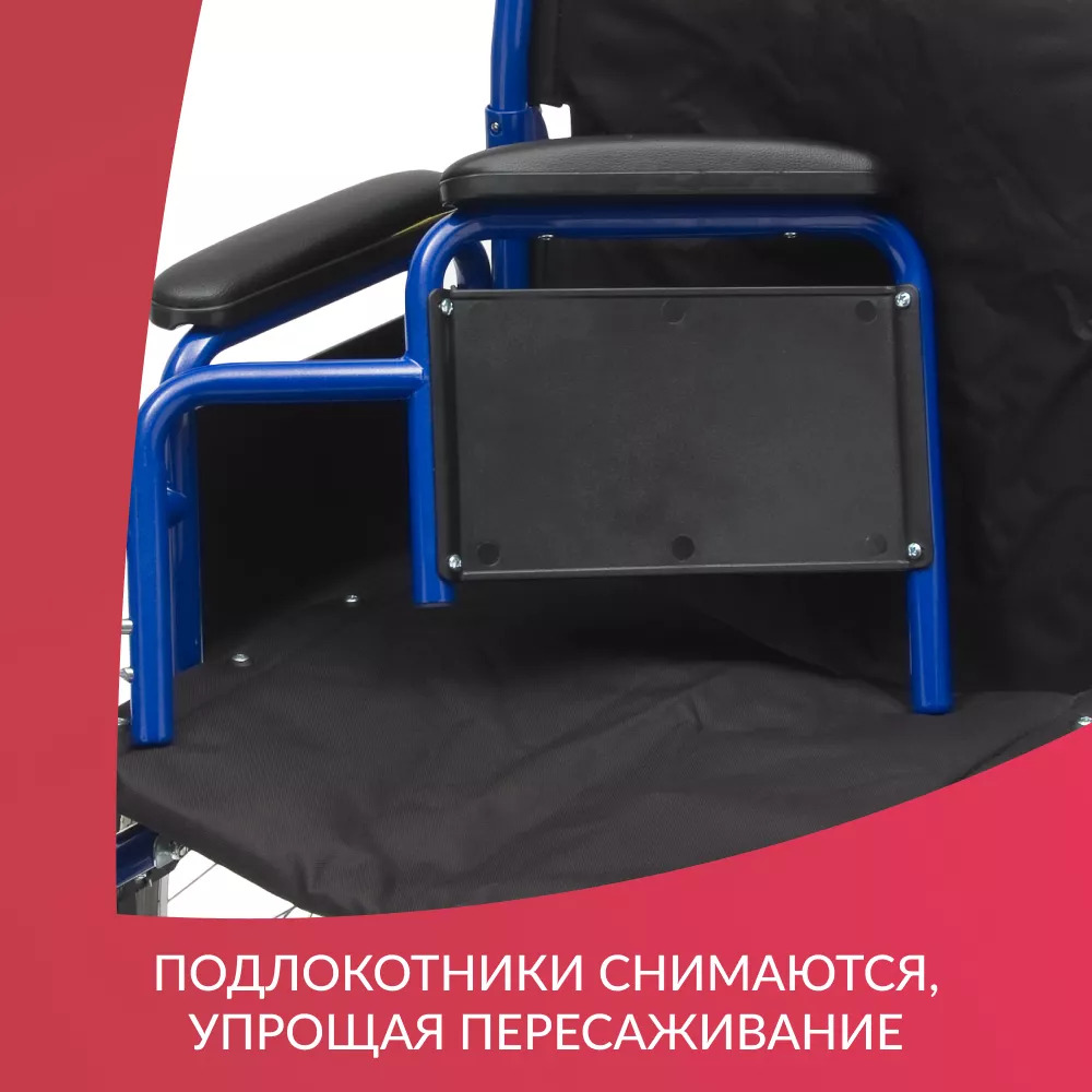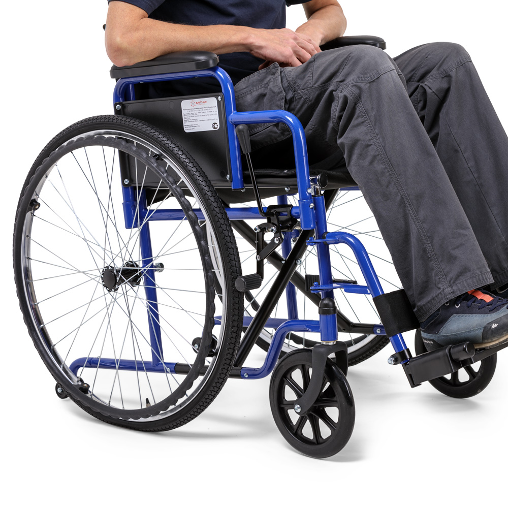 Складная рамаЧтобы сложить коляску, не требуется использовать какие-либо инструменты. В сложенном виде она удобна для переноски и не занимает много места при хранении.Мягко и уютноНаходиться в таком кресле удобно в течение всего дня, ведь каждая деталь кресла сделана с заботой. Сиденье и спинка инвалидной коляски очень мягкие и приятные телу, изготовлены из прочного водоотталкивающего материала. Ширина сиденья 46 см рассчитана на пользователей среднего телосложения.Удобство в мелочахПодлокотники могут сниматься для комфортного пересаживания в кресло или из него. Ступенчатая форма подлокотников дает возможность удобно расположиться у обеденного стола. Подножки поворотные и также съемные для легкого подъезда к мебели; имеется мягкая подставка под голени.Колесная базаЦельнолитые колеса обычно используются внутри помещений, но также подойдут для недолгих прогулок на свежем воздухе по ровному покрытию. Обе пары колес устойчивые и маневренные – коляской легко управлять и сидящему, и сопровождающему.БезопасностьНе переживайте о безопасности: каркас коляски изготовлен из прочной стали с защитным покрытием. Сидящий фиксируется в кресле регулируемыми ремнями, а встроенные антиопрокидыватели гарантируют устойчивость на неровных поверхностях. Коляска снабжена стояночными тормозами, которые прочно удерживают ее на время остановки.Характеристики