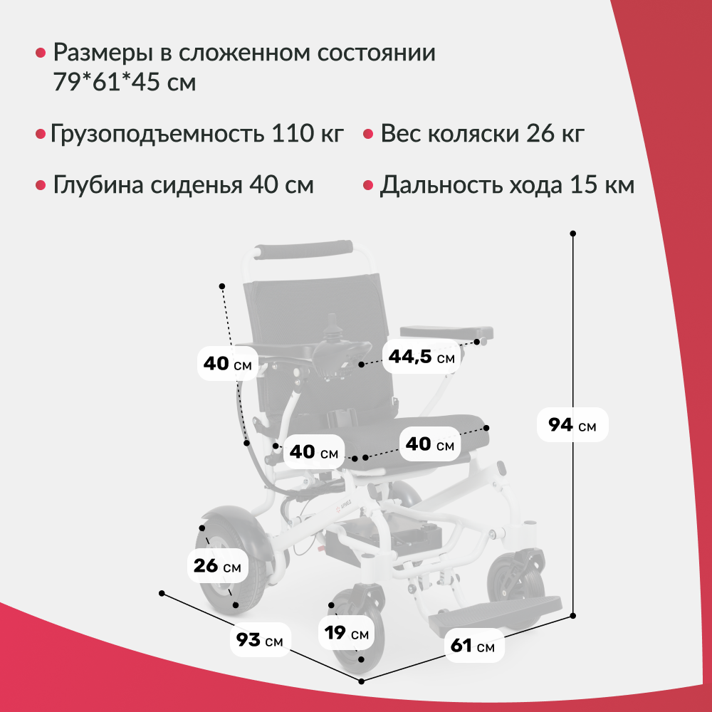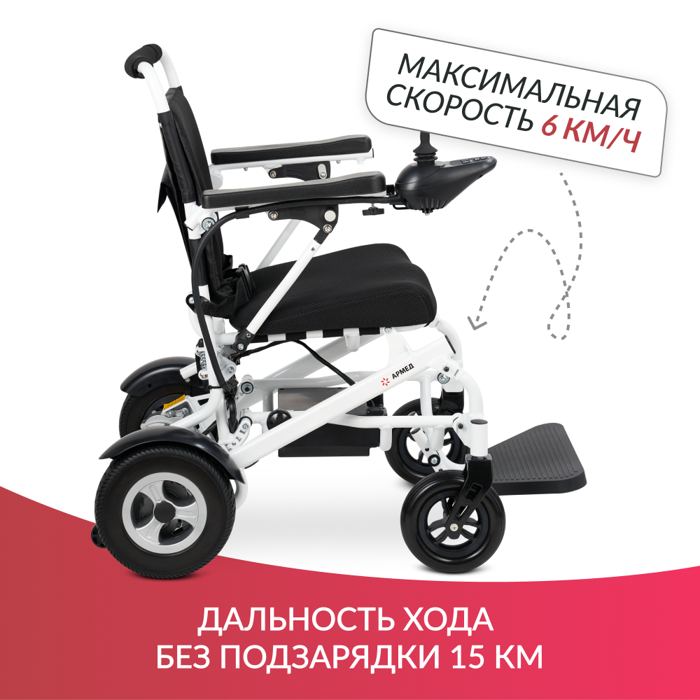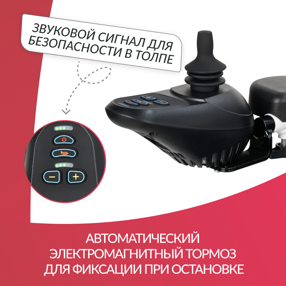 Облегченная рамаКоляска JRWD602К весит всего 26 кг, что позволит брать ее с собой на ежедневные прогулки и в путешествие. Рама легко складывается, дополнительно упрощая хранение и транспортировку.КомфортабельностьНа сиденье расположена мягкая подушка, которая сделает комфортнее любую прогулку. Так как подушка съемная, ее чистка и дезинфекция не составит труда.Удобство в бытуПодлокотники откидываются для простоты усаживания. Также для удобства пересаживания предусмотрена складная моноподножка.Управление любой рукойДля управления движением и основными функциями предусмотрен удобный пульт, который можно установить как на левый, так и на правый подлокотник. С его помощью осуществляется управление движением, подача звукового сигнала, контролируется состояние аккумуляторов. Световой индикатор скорости имеет 5 делений.БезопасностьДля защиты от падения на уклонах и пандусах предусмотрена пара съемных роликовых антиопрокидывателей. Звуковой сигнал обозначит коляску и привлечет окружающих, если вдруг пациенту понадобится помощь. Автоматический электромагнитный тормоз зафиксирует коляску во время остановки.Характеристики