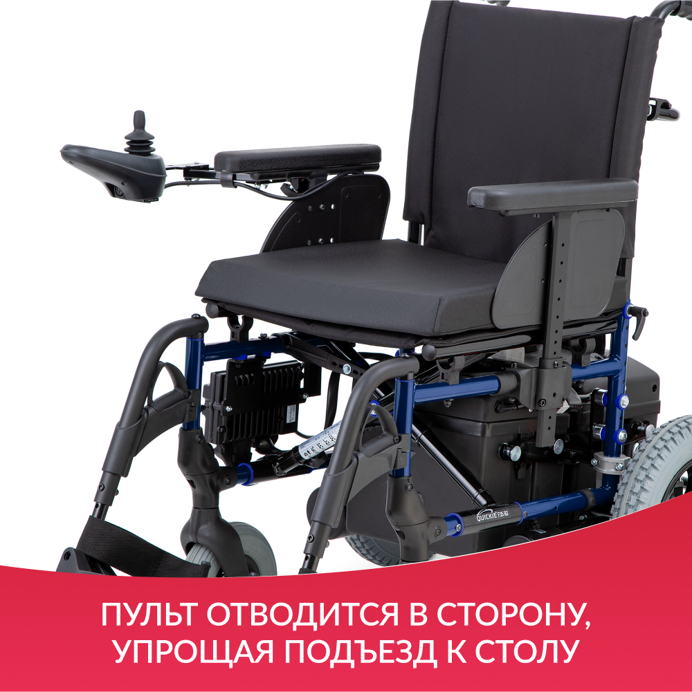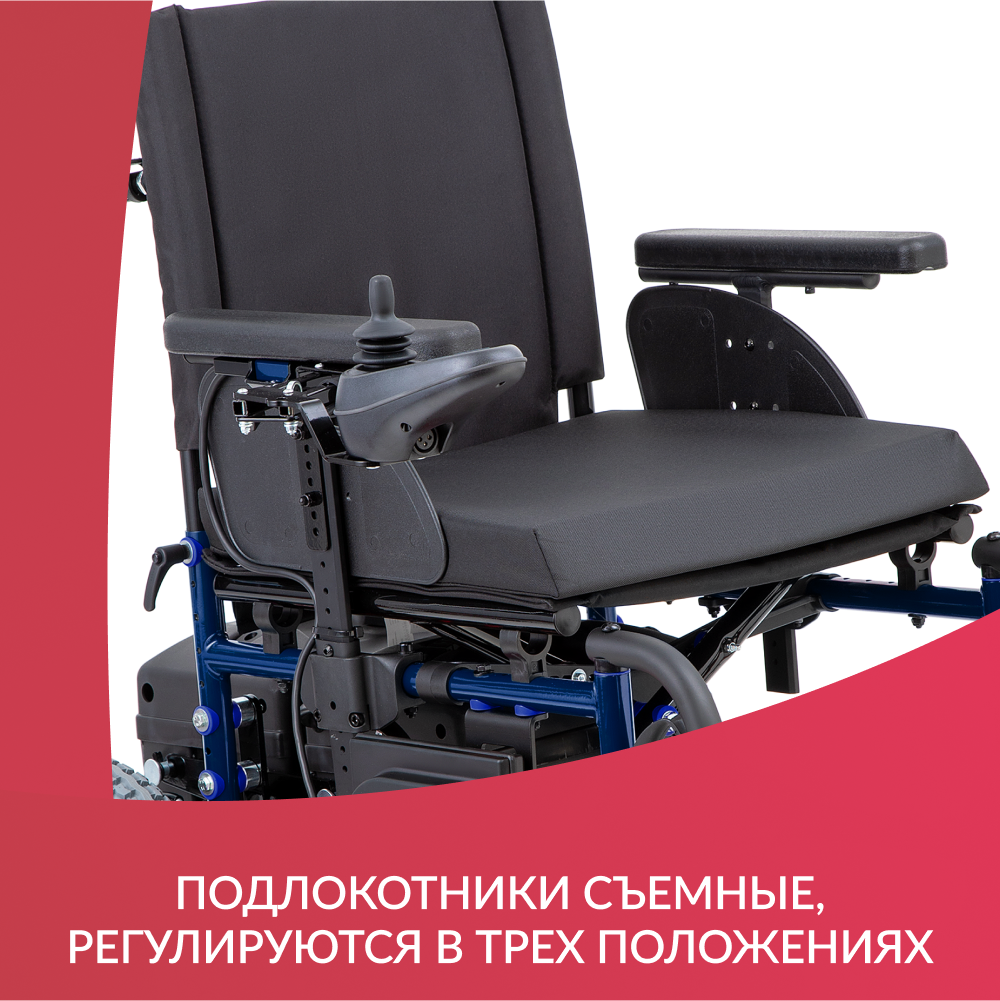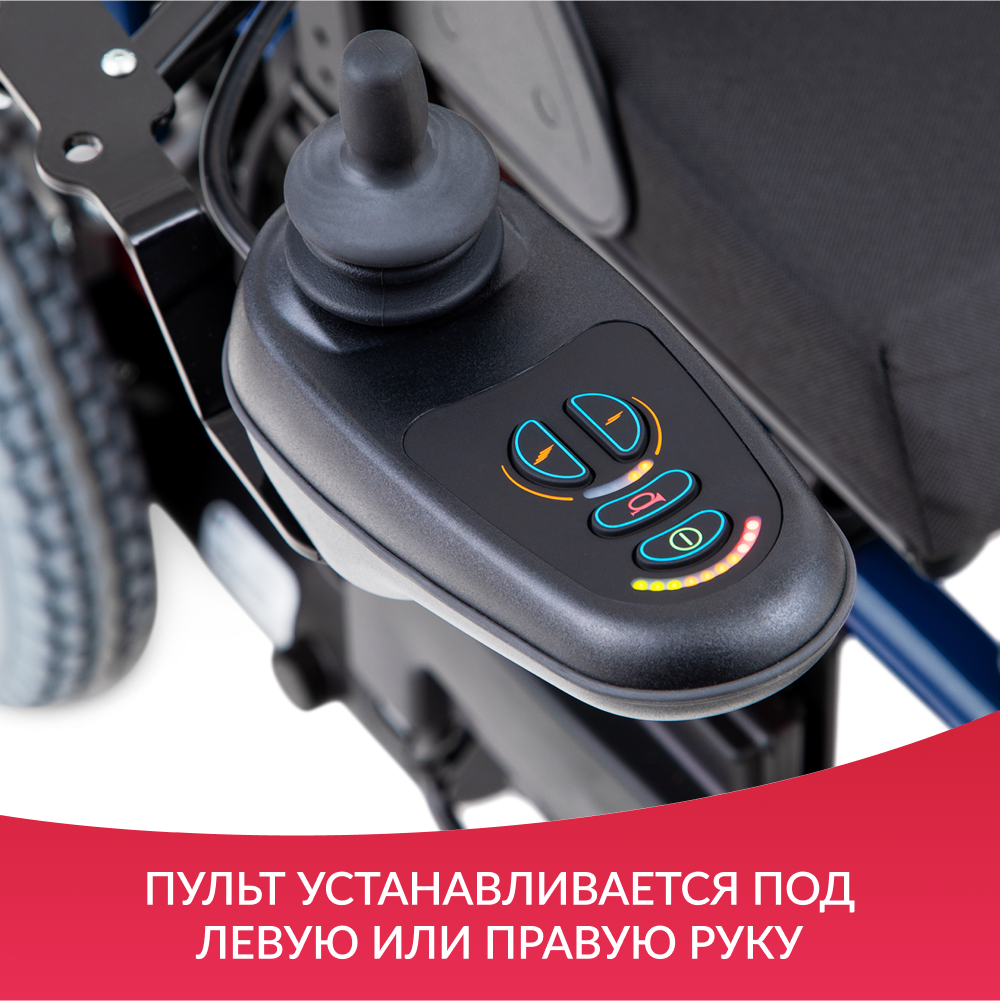РегулировкиПодлокотники легко можно регулировать по ширине, высоте и глубине. Подножки для ног съемные, их можно поворачивать как внутрь, так и наружу. Благодаря этому обеспечивается удобный подъезд к мебели и заезд в небольшие помещения, такие как лифты. Наклон спинки можно настроить вручную в диапазоне 4-55°.Контроль управленияКоляска оснащена удобным многопозиционным контроллером с чувствительным джойстиком, который обеспечивает плавное управление и маневренность. Джойстик может быть установлен как под левую, так и под правую руку и отводится в сторону для удобного подъезда к столу.Характеристики