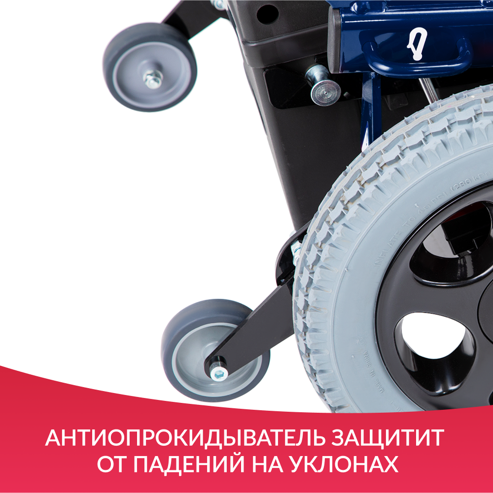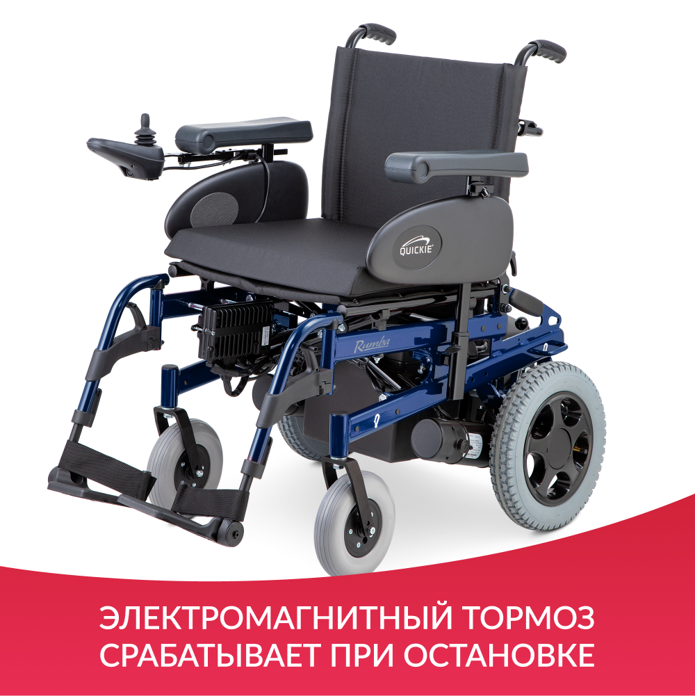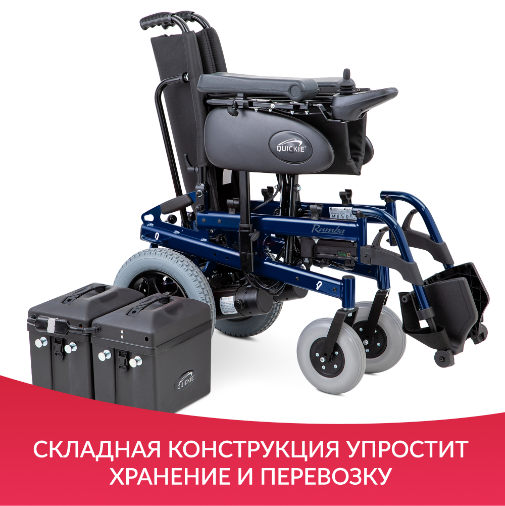 Легкая транспортировкаЛегко съемная спинка, выдвижные батарейки в сочетании со складывающейся рамой и тем фактом, что самая тяжелая часть кресла весит всего 37,4 кг, делают Румбу легкой и удобной для транспортировки в автомобиле и хранения в ограниченном пространстве.КомфортабельностьСиденье коляски может быть адаптировано под нужды пользователя с регулировкой ширины от 42 до 54 см шириной. Спинка регулируется вручную до 30 градусов. Подлокотники имеют регулировку по высоте и ширине, а складные подножки легко снимаются и регулируются по высоте.Контроль управленияКоляска Румба оснащена удобным многопозиционным контроллером с чувствительным джойстиком, обеспечивающим плавное управление и маневренность. Джойстик может быть установлен как под левую, так и под правую руку, настраивается по горизонтали и отводится в сторону для удобного подъезда к столу.Отличная проходимостьПневматические колеса обеспечивают мягкий безопасный ход по любым поверхностям, а также отличное сцепление с дорогой. Два мощных аккумулятора дают возможность преодолеть расстояние до 25 км без подзарядки с максимальной скоростью 6 км/ч. Максимальный угол подъема коляски - 10 градусов.Характеристики