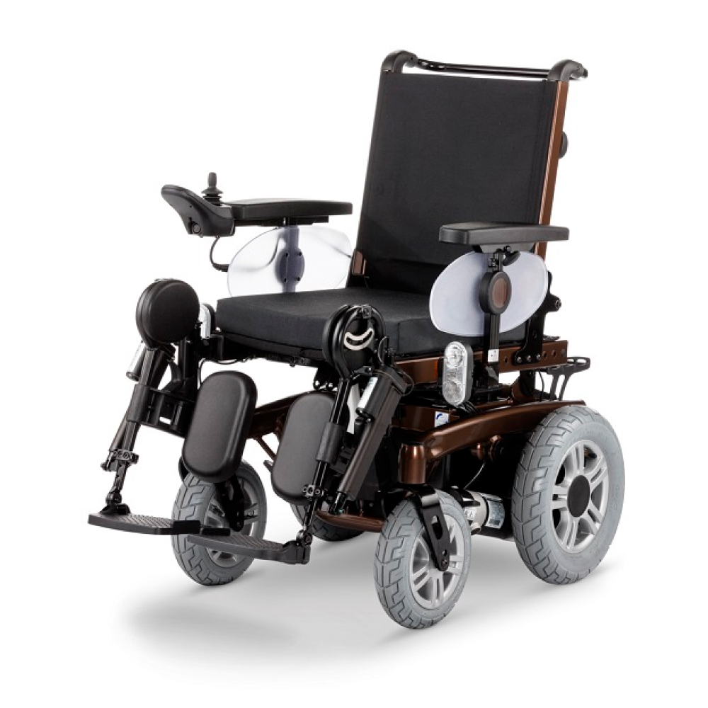Мощное и комфортное кресло-коляска Meyra iChair MC2 немецкого происхождения впечатляет внушительным набором функций. Яркий дизайн и небольшие размеры позволяют использовать эту модель как в домашних условиях, так и на прогулках. Управление коляской осуществляется с помощью джойстика управления на панели. При выключенном питании креслом может управлять сопровождающий с помощью удобной ручки.Контроль движенияУправление коляской осуществляется с помощью пульта. Пульт для электрорегулировки сидения имеет регулировку по длине и высоте. Скорость движения коляски составляет 10 км/ч. Емкие аккумуляторы расположены под креслом и защищены специальным боксом. Их заряда хватит на преодоление расстояний до 40 км без подзарядки.БезопасностьРоликовое антиопрокидывающее устройство позволяет безопасно преодолевать препятствия и крутые подъемы. Компактные размеры в сочетании со встроенными антиопрокидывателями обеспечивают коляске мобильность в ограниченном пространстве. Для безопасного передвижения в темное время суток кресло-коляска имеет: фары LED, поворотники, а также ремень безопасности.КомфортабельностьНа кресло установлено контурное сиденье ErgoSeat, которое обеспечивает комфортное пребывание в положении сидя. Кресло имеет электрорегулировку угла наклона сидения. Спинка 50 см оснащена регулировкой плотности и механической регулировкой угла наклона. Подлокотники с регулировкой высоты и глубины, а съемные раздельные подножки раздельные с регулировкой угла наклона. Для личных вещей данной комплектации предусмотрен багажник.ПроходимостьКолесная база комплектации медиум включает в себя пневматические шины: передние колеса 10 дюймов FSH 50 см, задние - 14 дюймов с брызговиками. Коляска имеет амортизационные рессоры, которые поглощают удары при движении по неровной дороге. Это значительно повышает комфорт использования на сложной местности и в разных условиях.Характеристики