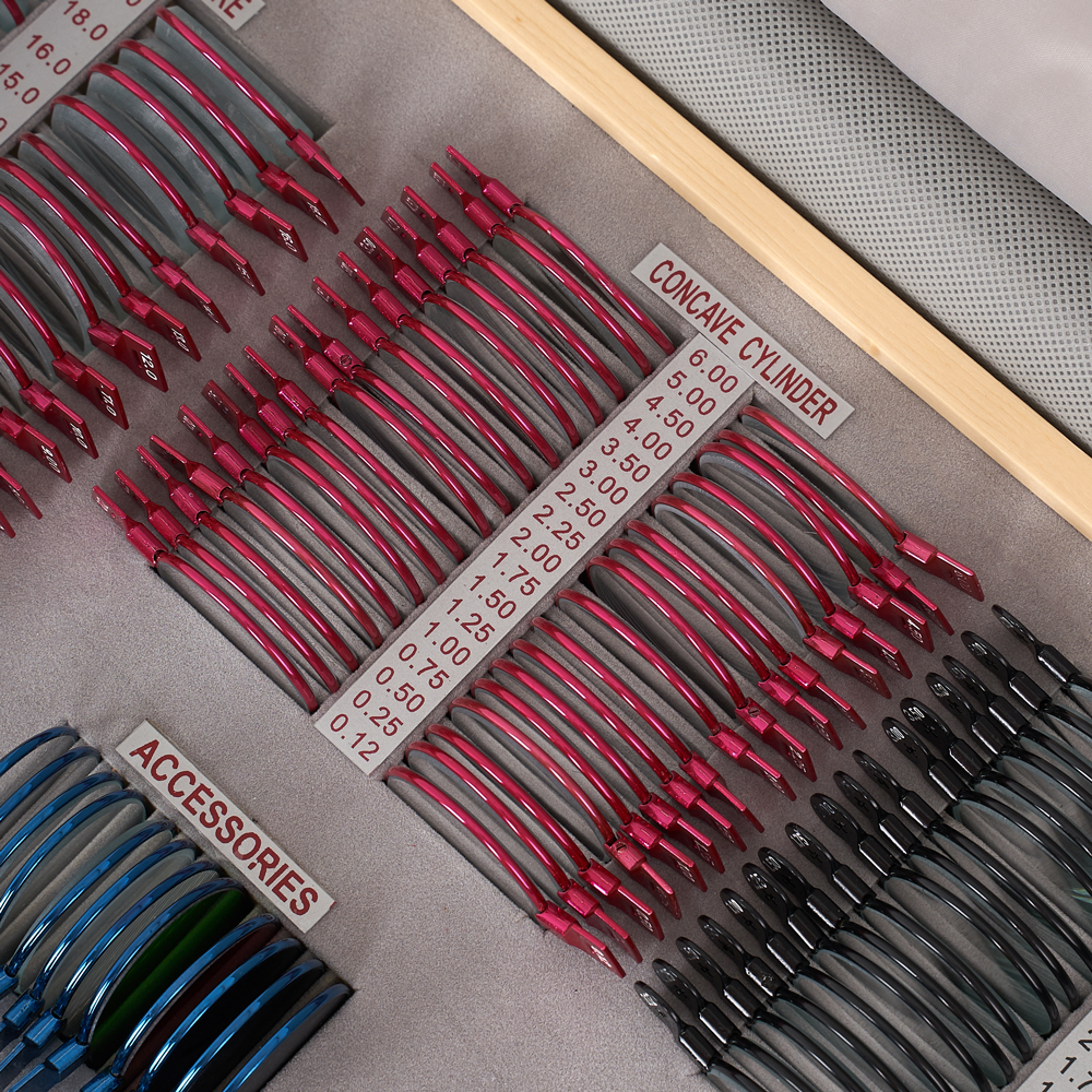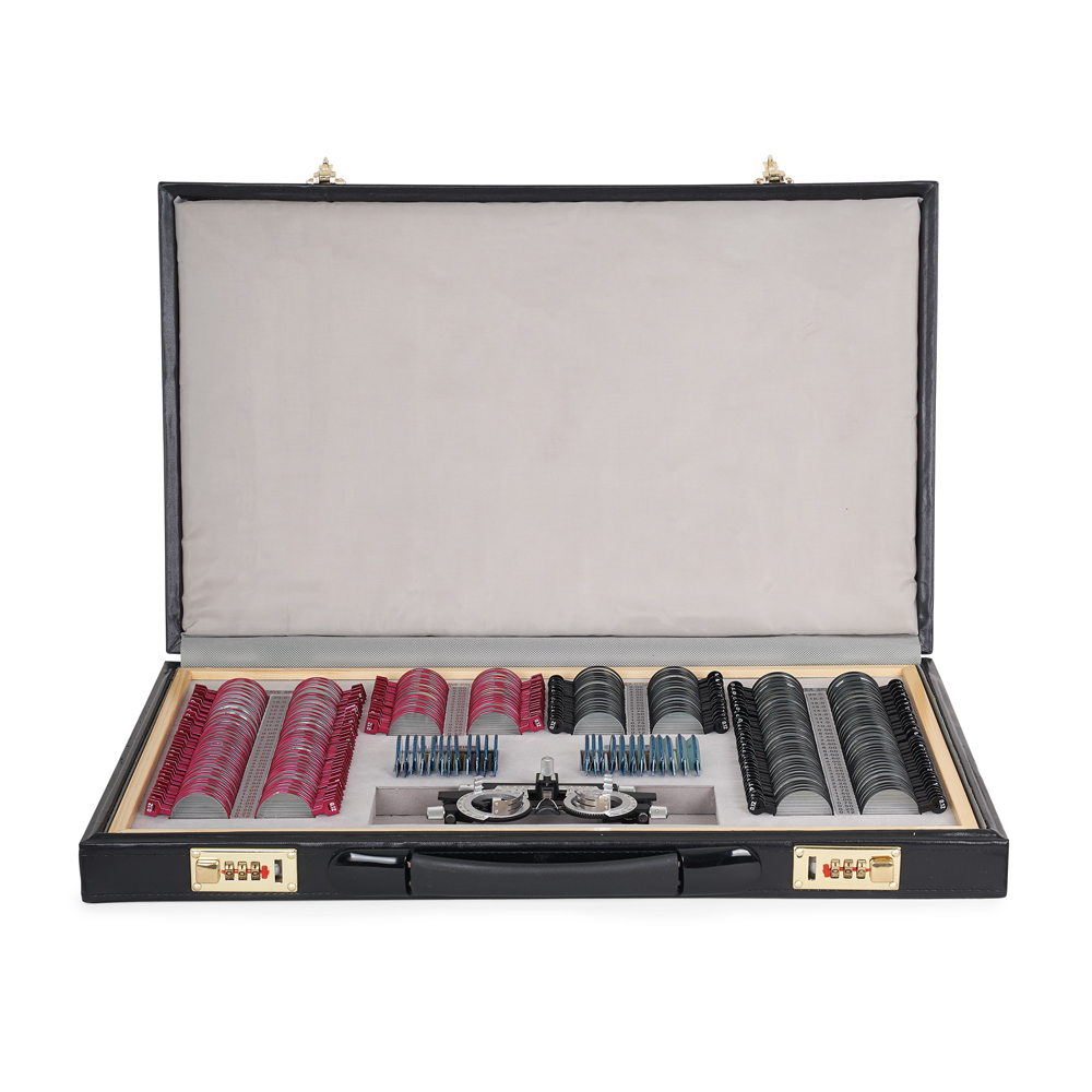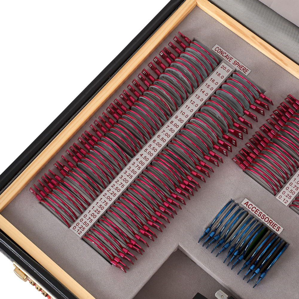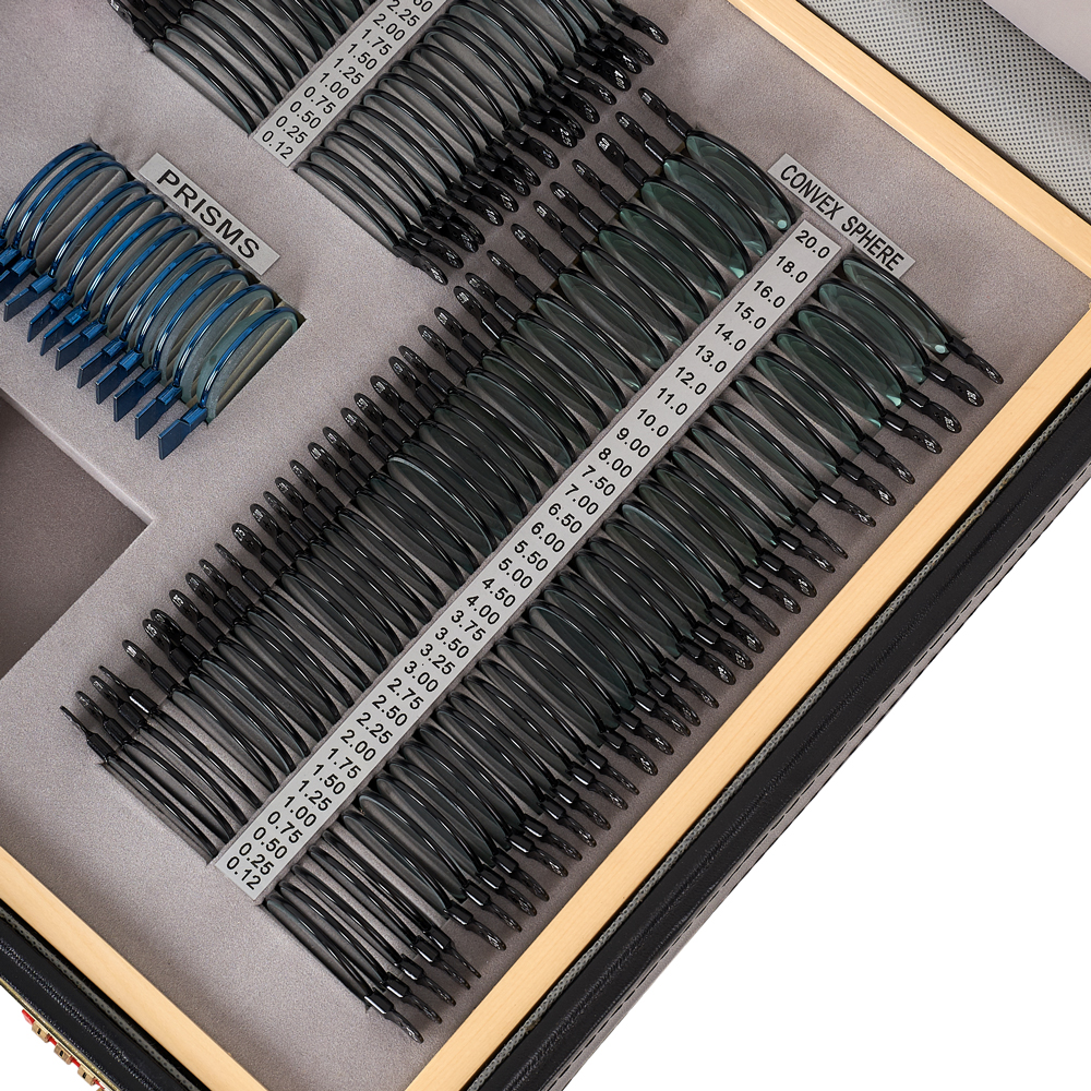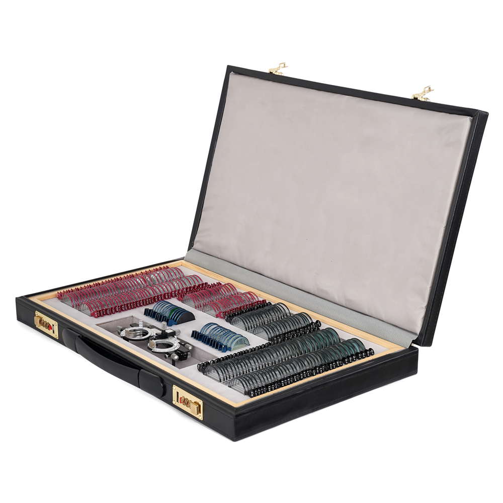 Офтальмологический набор из 232 линз предназначен для исследования зрения и диагностики глазных заболеваний, таких как астигматизм, миопия, гиперметропия, пресбиопия, цветовая слепота и страбизм. Набор можно использовать в офтальмологических кабинетах и оптических магазинах. Благодаря прочному кейсу из экокожи удобен для стационарных и передвижных кабинетов. Специальные линзы в наборе дополнены универсальной пробной оправой. В набор входят сферические, цилиндрические, призматические, матированные и цветные линзы, окклюдатор, пластина точечных отверстий, щелевой образец, линза с плоским полем зрения, пробная универсальная оправа и Maddox стержни.