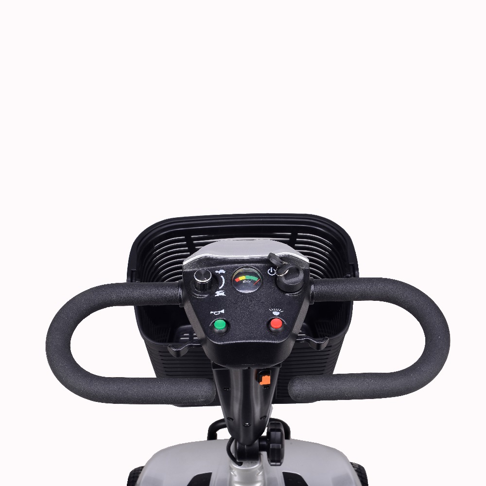 Скорость и дальность ходаСкорости скутера достаточно для маневрирования по улицам города, торговым площадкам и для прогулок. Одного заряда аккумулятора хватит для передвижения в течение всего дня. При необходимости переместить скутер без использования двигателя достаточно сдвинуть специальный рычаг, находящийся в нижней правой части сиденья.