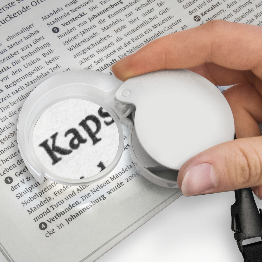 Асферическая складная лупа Eschenbach с подсветкой mobilent LED для чтения - идеальный вариант для того, чтобы брать ее с собой в кармане, сумочке или на шее. Удобная и легкая, стильная и компактная лупа станет Вам отличным помощником в магазине и дома, увеличивая мелкий шрифт на упаковке продуктов, лекарств и даже книг. Данная модель имеет 10-ти кратное увеличение с диаметром асферической линзы 35 мм и со светодиодной подсветкой. Складной пластиковый футляр закрывает линзу и защищает ее от пыли.