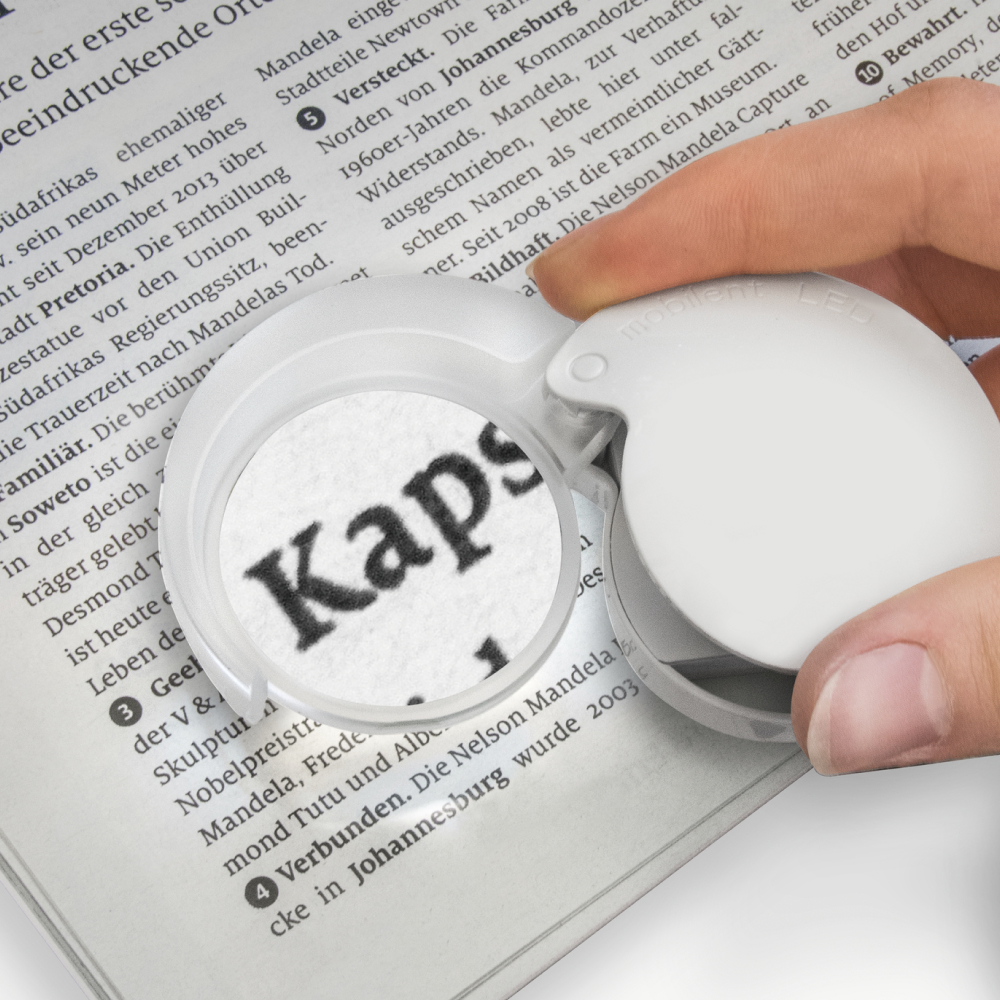Ищете идеальную лупу? Лупа Eschenbach с подсветкой mobilent LED - удобная и легкая, стильная и компактная лупа станет Вам отличным помощником в магазине и дома, увеличивая мелкий шрифт на упаковке продуктов, лекарств и книг. Это отличная модель лупы, которую удобно брать с собой в кармане, сумочке или на шее. Данная лупа имеет 7-ми кратное увеличение с диаметром асферической линзы 35 мм и со светодиодной подсветкой. Складной пластиковый футляр закрывает линзу и защищает ее от пыли.