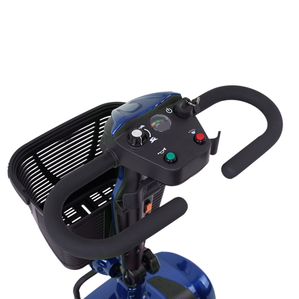 Удобное управлениеВсе элементы управления скутером расположены на одной панели. Это пусковой переключатель, рычаги управления, ручка регулировки скорости, индикатор питания, кнопка звукового сигнала, кнопка передней фары и поворотников.КомфортабельностьПередвигаться в скутере очень удобно благодаря креслу со спинкой, мягкой подушкой и подлокотниками. Элементы кресла выполнены из прочной экокожи, за которой просто ухаживать. Кресло вращается, обеспечивая удобную посадку с любой стороны. На рулевой раме расположена вместительная пластиковая корзина для покупок и личных вещей, которые пригодятся на прогулке.Скорость и дальность ходаРазмеренной скорости скутера хватит для спокойного маневрирования по улицам города, торговым площадкам и для прогулок. Одного заряда аккумулятора хватит для передвижения в течение всего дня. Чтобы переместить скутер без использования двигателя, достаточно воспользоваться специальным рычагом, находящимся в нижней правой части сиденья.Характеристики