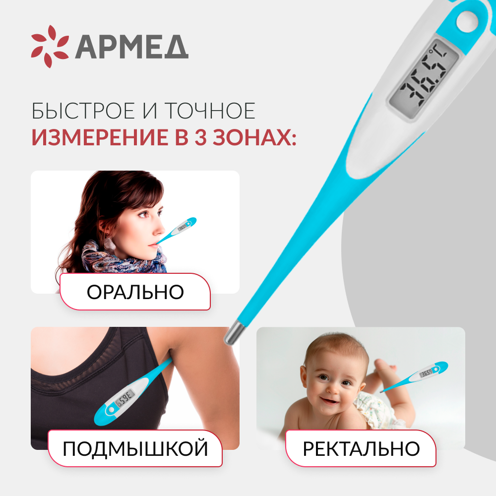 ГИБКИЙ НАКОНЕЧНИКДля более комфортного использования, а также снижения риска болевых ощущений термометр оснащен гибким наконечником.ТРИ ЗОНЫ ИЗМЕРЕНИЯТермометр может измерять температуру тела тремя способами: подмышечно, орально и ректально.ХРАНЕНИЕ ДАННЫХДанные последнего измерения сохраняются в памяти устройства. Так удобнее отслеживать динамику изменений состояния пациента. Данные перезаписываются в автоматическом режиме.Характеристики